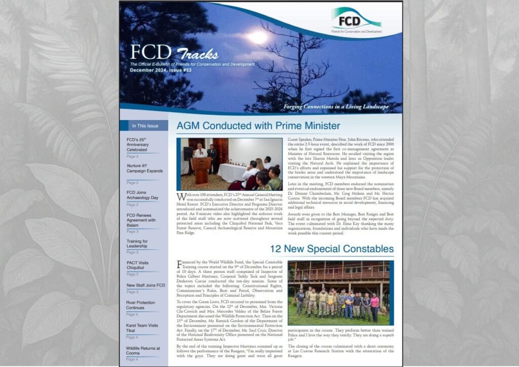 FCD Tracks – Issue #53 (December 2024) This issue celebrates the 25th Anniversary of Friends for Conservation and Development (FCD) and highlights key achievements and ongoing efforts in conservation and community engagement. Key topics include: 25th Anniversary Highlights: A reflection on FCD’s journey from its youth-led origins to becoming a leading conservation organization in Belize. […]