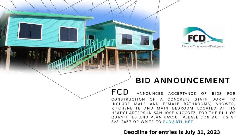 FCD is accepting bids for the construction of a cement concrete staff dorm sizes 18.5’ x 18.1’ to include male and female bathroom, shower, kitchenette and main bedroom. Interested parties can call 823-2657 or write fcd@btl.net to request for plan design and specifications. Construction is to occur at the main FCD headquarters in San Jose […]